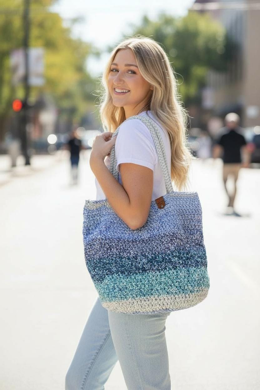 This handmade crochet tote bag features a beautiful ombré blend of soft blues and creamy neutrals for a relaxed, coastal-inspired look. Carefully crafted with durable yarn, this bag is lightweight yet sturdy—perfect for everyday use.